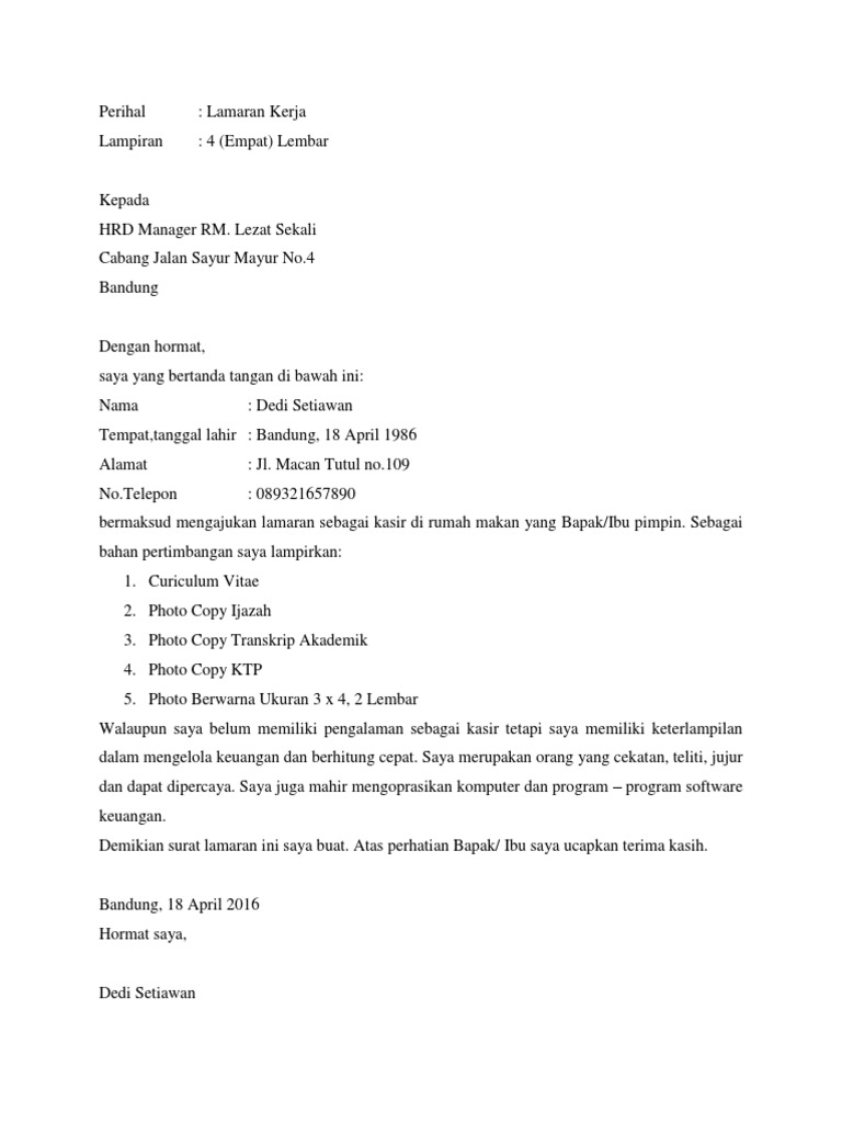 Contoh surat lamaran kerja sebagai operator produksi terbaru. Kalau iya, maka kamu perlu surat lamaran kerja yang menarik untuk memikat hati pimpinanmu. Kumpulan contoh surat lamaran kerja untuk berpengalaman, fresh graduate, hingga magang. Daftar isi hide 18 contoh surat lamaran kerja terbaru dan lengkap dengan berbagai jenisnya 9. Untuk melengkapi beberapa data yang diperlukan sebagai bahan pertimbangan. Contoh surat lamaran kerja atau cara membuat surat lamaran kerja sebagai karyawan pabrik.di instagram bahwa toy store sedang mencari seorang karyawan di bagian admin sosial. Tempat dan tanggal pembuatan surat. Langkah pertama sebelum menuliskan contoh surat lamaran kerja berdasarkan iklan paling lengkap adalah memastikan terlebih dahulu jika memang iklan lowongan yang dimuat memang benar. Kamu siap untuk bekerja lebih keras lagi? Di bawah ini, kami telah menyediakan berbagai contoh. Setiap tahun semakin banyak mahasiswa yang mendapatkan gelar sarjana. Dengan surat lamaran pekerjaan pihak perusahaan bisa membaca dan menebak karakter dari pelamar kerja. Contoh surat lamaran kerja adalah sebuah contoh surat lamaran untuk mendaftar/apply sebuah pekerjaan yang kita inginkan.